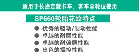 全新上市的鄧祿普SP660,采用DECTES技術(shù),是一款可供卡/客車使用的全天候真空胎,適用于長(zhǎng)途定載卡/客車全輪位使用。SP660的產(chǎn)品規(guī)格有11R22.5;12R22.5;295/80R22.5三個(gè)規(guī)格,其產(chǎn)品特點(diǎn)為: