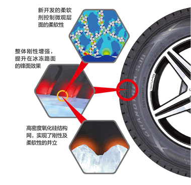 由二氧化硅、高分子化合物、柔軟劑組成,通過(guò)特定的分子結(jié)構(gòu)組合,能夠非常有效的發(fā)揮橡膠整體的柔軟性,其中高密度氧化硅的使用實(shí)現(xiàn)了剛性及柔軟性的并立,從而擁有比普通輪胎更大的摩擦力與耐磨性,確保其在極低溫度下仍保持柔韌質(zhì)地,為您的行車(chē)安全提供最佳保障。