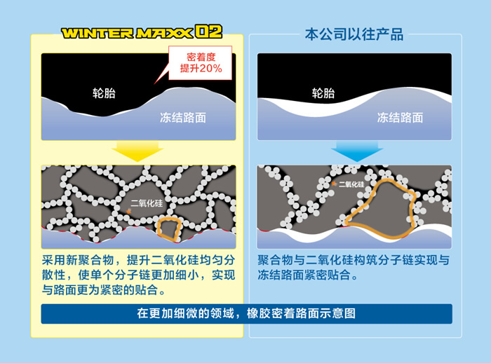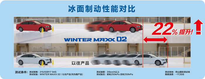 在冰上實(shí)驗(yàn)中,WINTER MAXX02的制動(dòng)距離相比本公司以往產(chǎn)品縮短了22%,實(shí)現(xiàn)了更出色的冰上安全性與操控性。