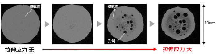 如果合成橡膠試驗品在受到垂直于金屬板方向上的拉伸力時,根據(jù)橡膠自身的特性,橡膠試驗品會向垂直于受力的方向收縮。然而,由于試驗品是被粘貼固定在金屬板上,所以受力時卻又無法自行收縮,結(jié)果致使橡膠膨脹,進而可以使我們通過CT直接觀察到橡膠內(nèi)部及其“孔洞”形成的過程。