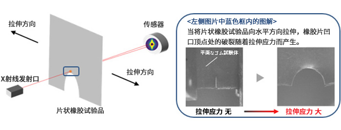 將帶有凹口的片狀合成橡膠試驗品沿水平方向拉伸,用X射線小角散射法觀察凹口頂點處橡膠內(nèi)部“孔洞”的形成和增大情況。