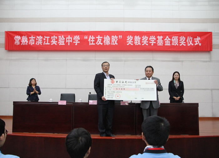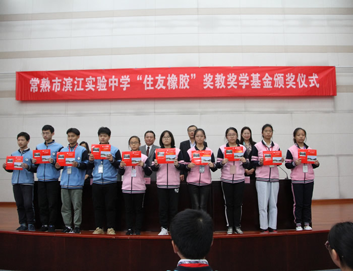住友橡膠(中國)有限公司于2015年創(chuàng)立 “住友橡膠獎教獎學基金”,目前,捐贈活動已經連續(xù)進行4年。住友橡膠董事長山田先生在頒獎致辭中表示:“獎教獎學基金設立的初衷,是獎勵認真投入教學事業(yè),精心培育青少年的各位教師,以及為不辜負老師期待,奮發(fā)向學,立志成才實現夢想的各位同學”。濱江實驗中學負責人代表全校師生向住友橡膠(中國)有限公司對發(fā)展當地教育事業(yè)提供的支持及幫助表達了由衷的感謝。
