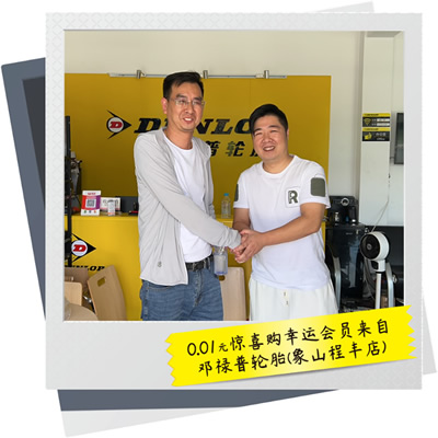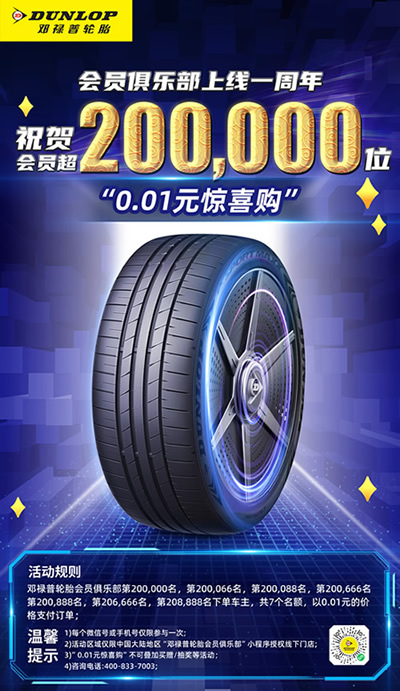 為答謝會員的支持,鄧祿普輪胎特別推出寵粉周年慶活動 —“0.01元驚喜購”。 對鄧祿普輪胎會員俱樂部第200,000名、第200,066名、第200,088名、第200,666名、第200,888名、第206,666名、第208,888名下單車主,提供了以僅需0.01元的價格支付訂單的特別禮遇,共7個名額。