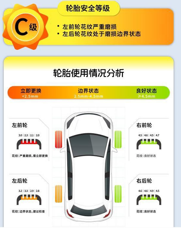 據(jù)輪胎花紋深度國家法定標準規(guī)定,輪胎花紋深度大于4.5mm被視為良好狀態(tài);2.5-4.5mm被視為臨界狀態(tài);一旦花紋深度低于2.5mm,輪胎便需要更換。值得注意的是,1.6mm為輪胎花紋的國家法定標準,當花紋深度達到極限值1.6mm時,車輛必須立即更換輪胎,以確保行車安全。