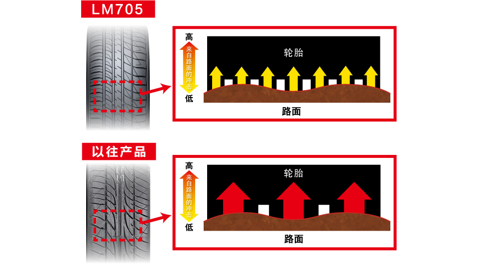 采用新技術(shù),對(duì)骨架(截面輪廓+胎面花紋)進(jìn)行優(yōu)化,提升胎側(cè)和胎面的緩沖性能,從而抑制路面沖擊導(dǎo)致的輪胎震動(dòng),提升“駕乘舒適感”和“靜音效果”。