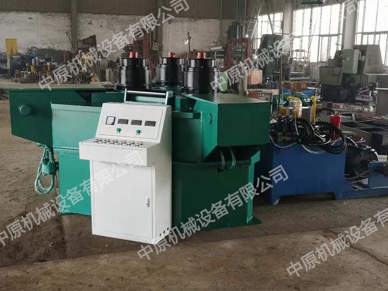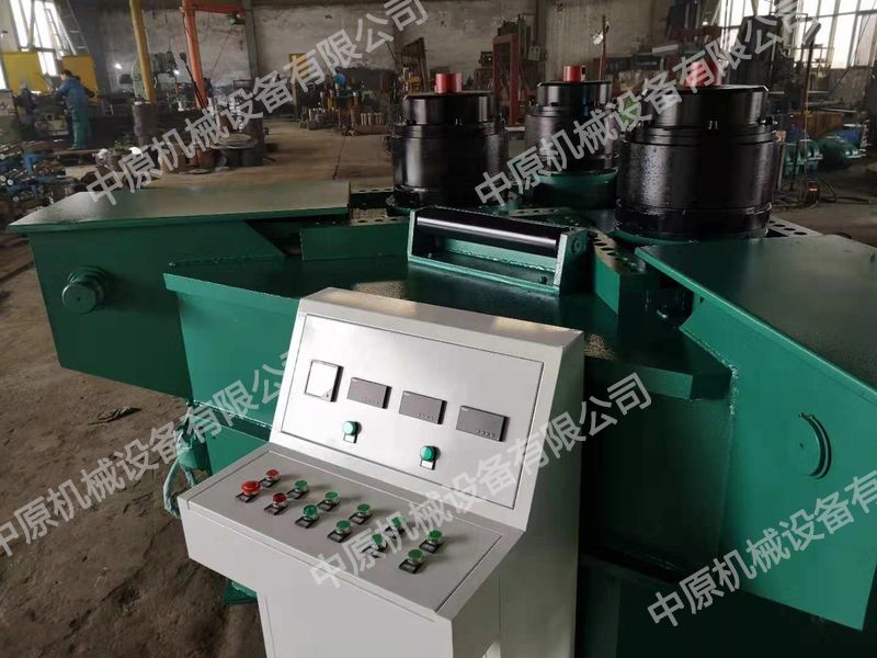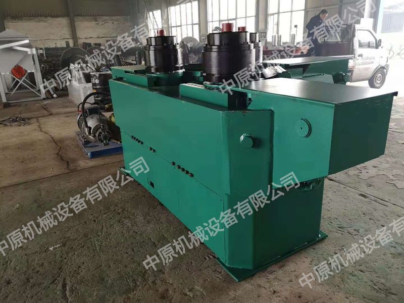 該機(jī)為叁輥型材卷圓機(jī),集機(jī)電一體。電機(jī)輸出的較高轉(zhuǎn)速通過傳動裝置(聯(lián)軸器,液壓馬達(dá),液壓油缸,齒輪等)轉(zhuǎn)換成所需的大扭矩低轉(zhuǎn)速,帶動兩主動輥實(shí)現(xiàn)旋轉(zhuǎn)運(yùn)動,為型材行走提供扭矩。兩個主動輥中心距可調(diào),被動輥通過液壓油缸前進(jìn)、后退實(shí)現(xiàn)位移,來控制直徑大小。三個工作輥成等腰三角形分布,通過調(diào)整移動輥實(shí)現(xiàn)這三個點(diǎn)形成的弧線達(dá)到所需彎曲半徑,借助被動輥的壓緊及兩主動輥的旋轉(zhuǎn)運(yùn)動,使型材經(jīng)過多次連續(xù)彎曲,產(chǎn)生永久性塑性變形,用于常溫狀態(tài)下將型材卷制成圓形,弧形等工件。